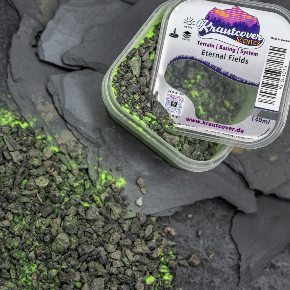 With our innovative Basecover fx mixes you can make your bases glow. The colored components in the mix can be excited with daylight or even more intensively with UV light and then produce a colorful glow. With the Eternal Fields Basecover, you can represent ancient powers, awaken the eerie undead or build radioactively contaminated areas as terrain. The mix is just as easy to use as the rest of our basecovers.